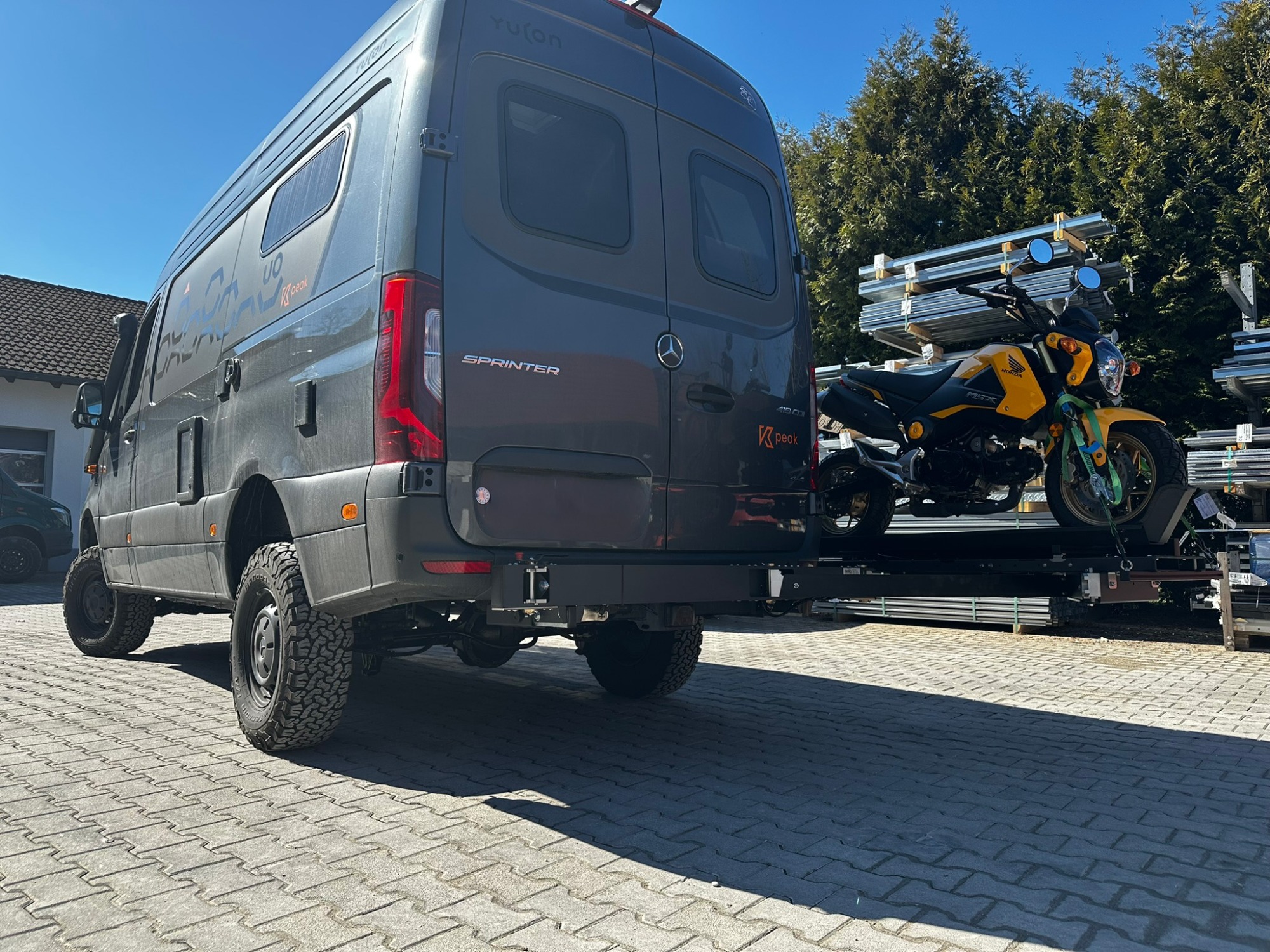 Zum Beispiel könnte erst einmal das Modul für einen Roller/leichtes Motorrad mit einteiliger Rampe bestellt werden, später dann eine Fahrradschiene mit dem Befestigungsholm um ein Motorrad und ein Fahrrad zu transportieren.